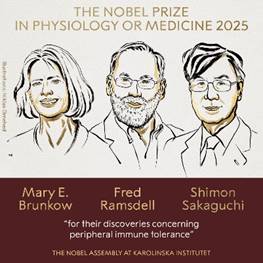 2025 का फिजियोलॉजी या मेडिसिन में नोबेल पुरस्कार मेरी ई. ब्रनको (यूएसए), फ्रेड राम्सडेल (यूएसए), और शिमोन सकागुची (जापान) को उनके रेगुलेटरी टी कोशिकाओं (Tregs) पर महत्वपूर्ण शोध के लिए दिया गया, जो इम्यून सिस्टम को शरीर पर हमला करने से रोकती हैं। सकागुची ने 1995 में Tregs की खोज की, जिससे परिधीय इम्यून टॉलरेंस का पता चला, जबकि ब्रनको और राम्सडेल ने 2001 में Foxp3 जीन की पहचान की, जिसके म्यूटेशन से IPEX सिंड्रोम जैसे ऑटोइम्यून रोग जुड़ते हैं। ये खोजें ऑटोइम्यून रोगों, कैंसर इम्यूनोथेरपी, और अंग प्रत्यारोपण को समझने में महत्वपूर्ण हैं और आधुनिक इम्यूनोलॉजी और चिकित्सा उपचार को बदल रही हैं।