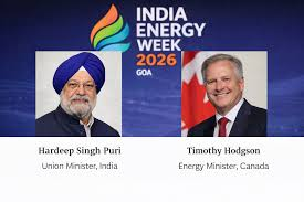 India and Canada signed a Joint Statement on Energy Cooperation during India Energy Week 2026 in Goa, marking the first visit of a Canadian Cabinet Minister to the event. Union Minister Shri Hardeep Singh Puri and Canada’s Minister H.E. Timothy Hodgson held bilateral talks and relaunched the India–Canada Ministerial Energy Dialogue, reaffirming cooperation on energy security and supply diversification.